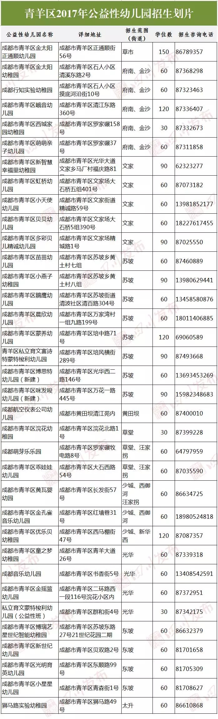 近日,成都市青羊区、锦江区、武侯区、金牛区、成华区和高新区、成都天府新区直管区陆续公布了各区公益性幼儿园招收学位、划片情况,记者为你打总报道,快看你家孩子读哪里!