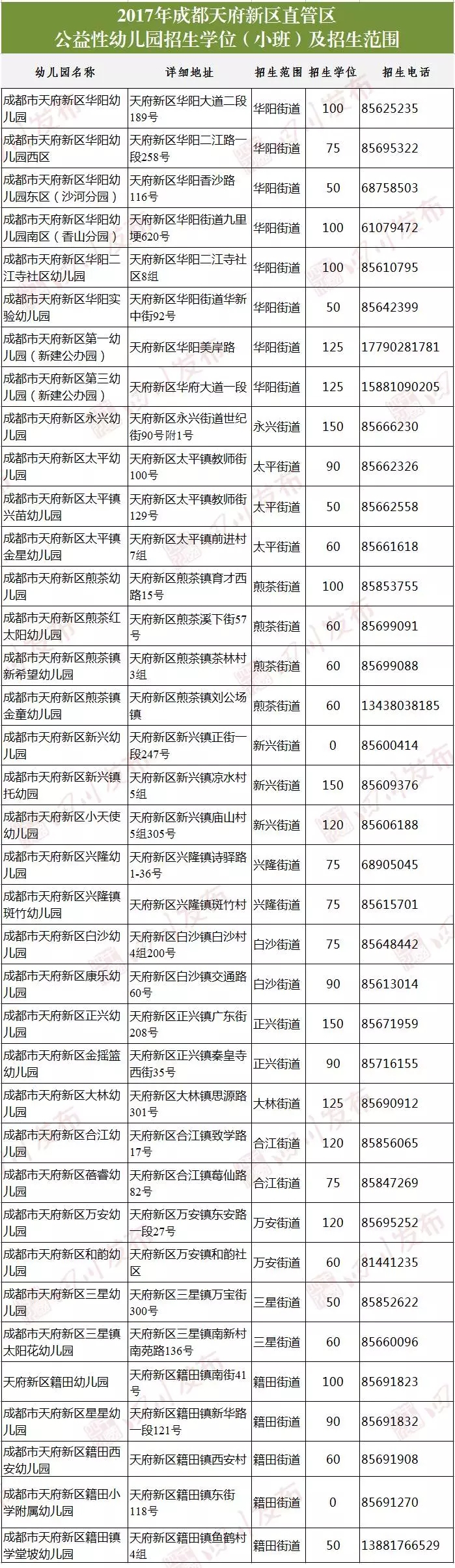 其中华阳街道户籍适龄幼儿法定监护人通过登陆成都市公益性幼儿园网上报名系统(xq.cdzk.net)进行网上报名,报名时间为6月12至16日。华阳街道的天府一幼(新建公办园)、天府三幼(新建公办园)、华阳幼儿园(含本部、西区、东区、南区)、华阳实验幼儿园、华阳二江寺社区幼儿园,若幼儿报名数大于学位计划数,采取微机派位方式录取,届时将邀请家长代表、园长代表、纪检人员等共同参与录取工作。其余12个街道根据实际情况做好本辖区户籍适龄幼儿的录取工作。