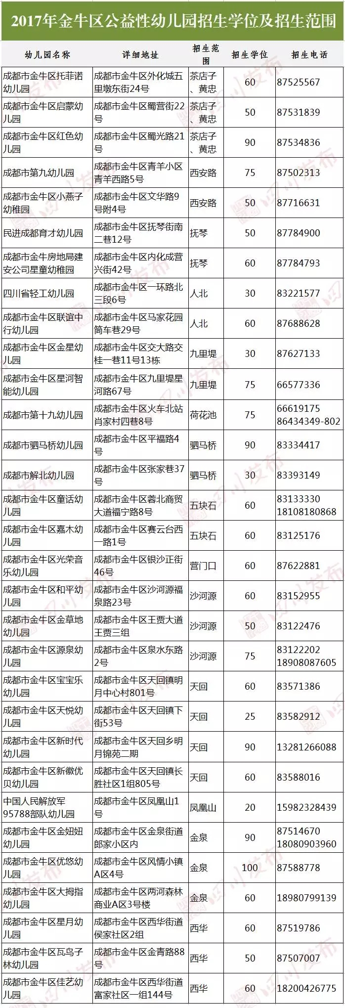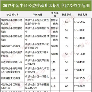 成都市金牛区全区31所公益性幼儿园2017年秋季学期招生学位1865个。各幼儿园优先招收符合幼儿园招生范围内街道户籍且年满3周岁(即2013年9月1日—2014年8月31日间出生)的幼儿入园。有空余学位,可招收其他幼儿入园。