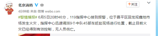 #警情播报# 6月5日20时46分,119指挥中心接到报警,位于昌平区回龙观鑫地市场发生火灾,指挥中心迅速调派9个中队45部车赶赴现场进行处置,截止目前火灾已经得到有效控制,无人员伤亡。