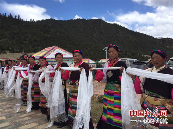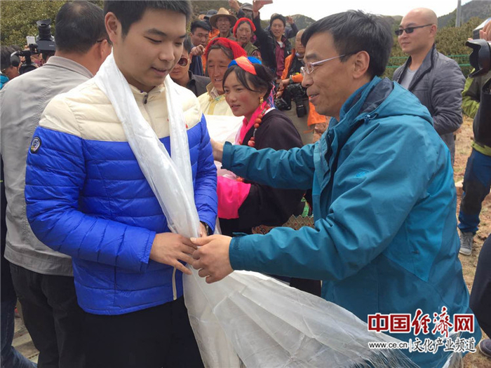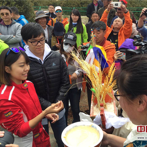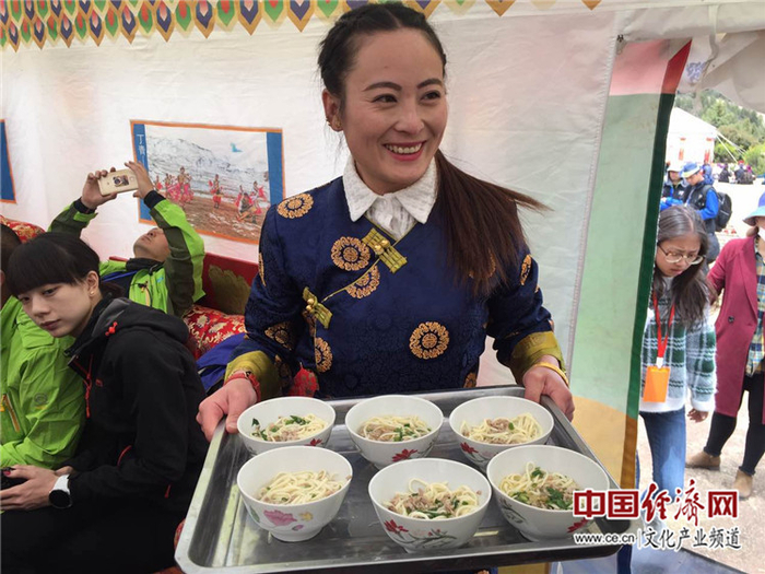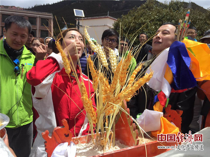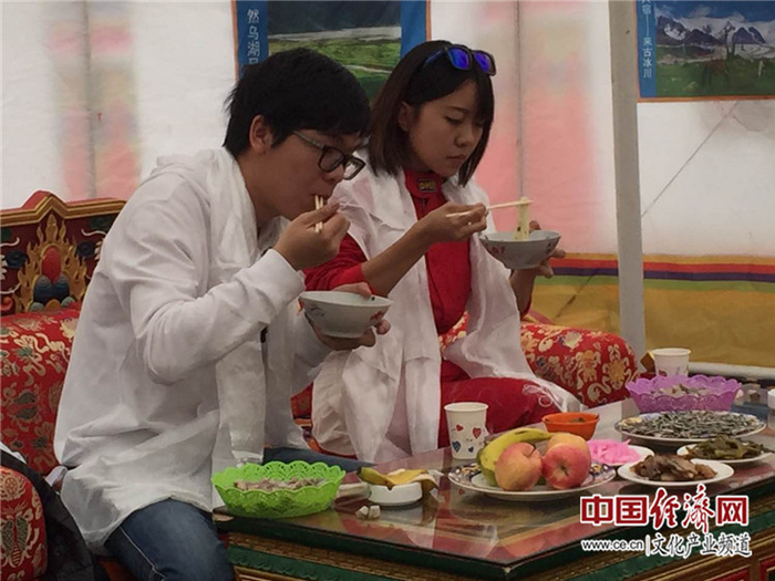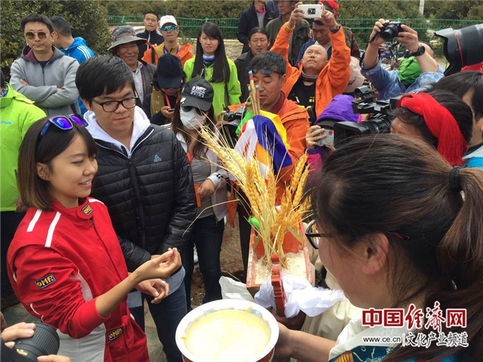 当地村民向车手棋手敬切玛。美女赛车手金蕊吃切玛 记者代玲/摄