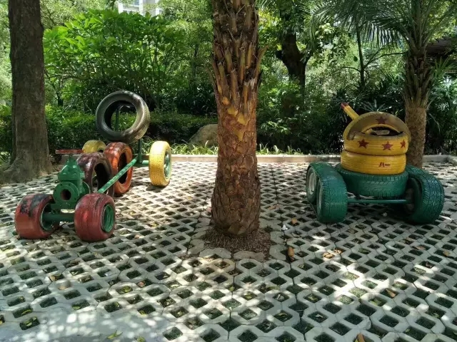 在距离景湖名郡1号岗不远处的角落,摆放着一部“赛车”和一部“坦克”。这个赛车由7个废轮胎组成,车身用钢管焊接,车头和方向盘是用废水阀做的,巧思令人佩服。