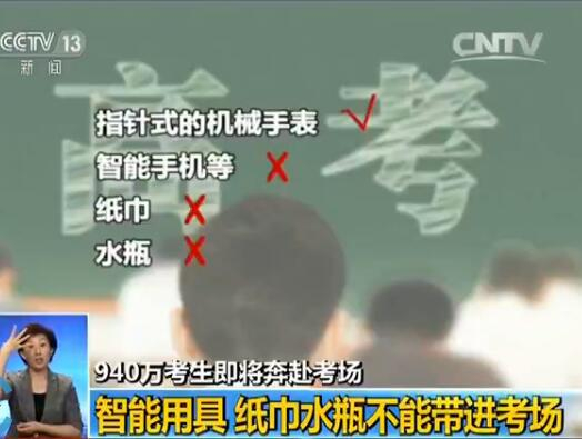 首先是在考试过程当中,只允许考生佩戴指针式的机械手表。智能手机等智能用具、以及纸巾、水瓶不允许带入考场,如果考生需要,可以向监考老师提出申请。如果考生忘带准考证,也不要着急,每个考点都有附带考生照片的资料,只要与考生相貌吻合,考生也可以进入考场,但下一场必须带准考证进入。