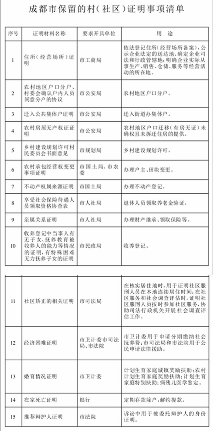 日前,省政府办公厅下发“通知”,要求各地要参照成都市经验做法,对本地各级、各部门要求村(社区)开具的各类证明材料进行集中清理,制定取消的村(社区)证明事项清单和保留的村(社区)证明事项清单。清理完成后,对未列入保留清单的证明事项,不得要求群众再提供。