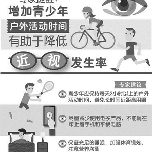 北京儿童医院眼科主任李莉说,减少近距离用眼及增加户外活动是防控近视的有效手段。建议孩子近距离用眼半小时后,向远处眺望或做做眼保健操缓解一下疲劳。现在很多孩子经常处于室内环境,对保护视力不利,课间休息时应到户外活动。有循证研究表明,每天2小时的户外运动有助于降低近视发生、发展的机率。