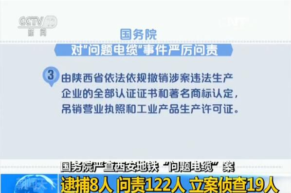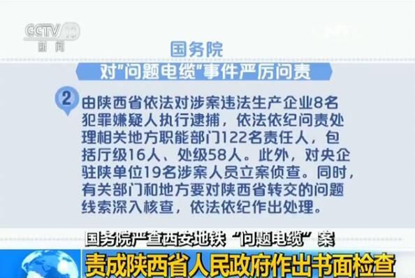 国务院对西安地铁“问题电缆”案严厉问责:逮捕8人问责122人