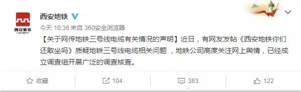 这一重大事件启源于3月13日,有网友在天涯发帖《西安地铁你们还敢坐吗》质疑地铁三号线电缆相关问题,西安地铁官方微博随后发布声明称,地铁公司高度关注网上舆情,已经成立调查组开展广泛的调查核查。