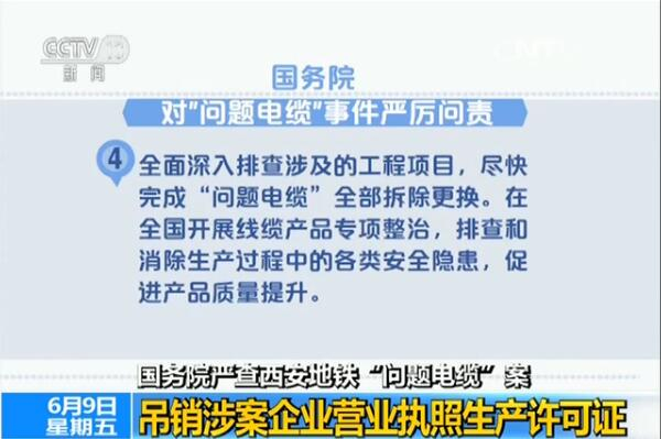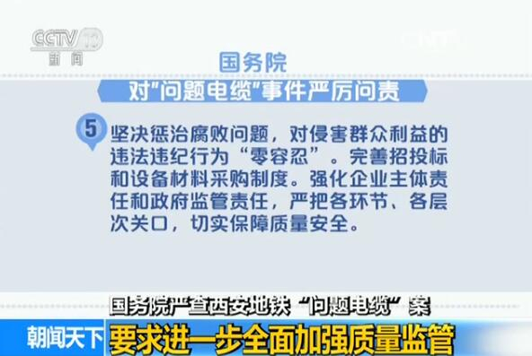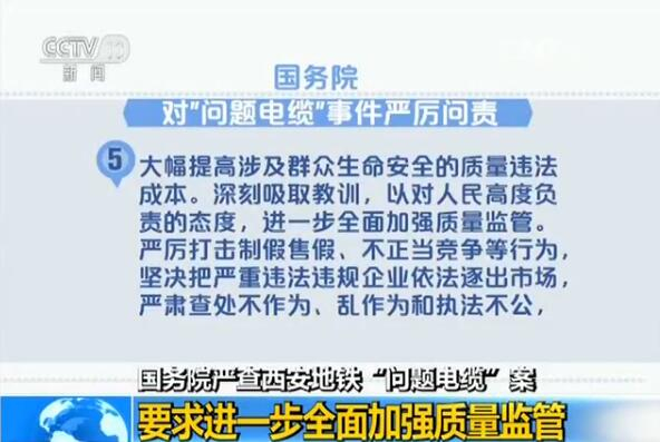 央视网消息:日前,国务院决定依法依纪对西安地铁“问题电缆”事件严厉问责,进一步强化全过程全链条全方位监管,确保质量安全。
