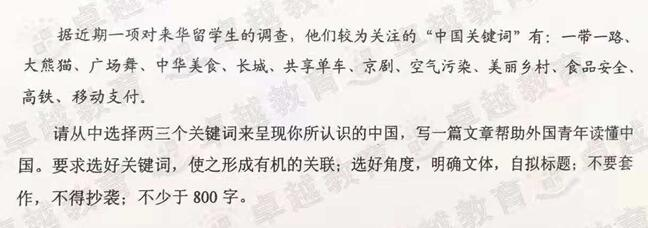 卓越教育高考研究专家团队认为,今年高考全国卷I语文作文,与往年相比,难度有所降低,命题思路上完全符合《考试大纲》的要求:命题形式采用了《考试说明》第62页“题型示范”当中“调查报告”+“关键词”的命题形式,内容完全符合《考试大纲》里对“立德树人”的要求,要求帮助外国青年读懂中国,关键词也与《考试说明》中列出的“国际影响、民生改善、科技水平、开放程度”等展现我国大众文化自信话题的探讨。
