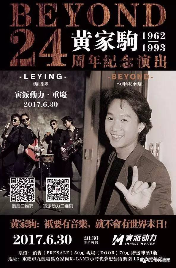 华龙网6月9日14时26分讯 对于喜欢BEYOND的人来说,六月令人难以忘怀,而提到BEYOND大家首先联想到的就是那场最为经典的演唱会《91生命接触香港红磡演唱会》,热血沸腾的俾面派对、高温派对以及旧日足迹之后气势磅礴的岁月无声,这一系列震撼人心的深刻记忆,也造就了歌迷心中永不磨灭的黄家驹。6月30日,来重庆市九龙坡区袁家岗K-LAND小时代梦想艺术乐园5楼,听Beyond24周年纪念家驹演出-复刻91生命接触演唱会。