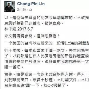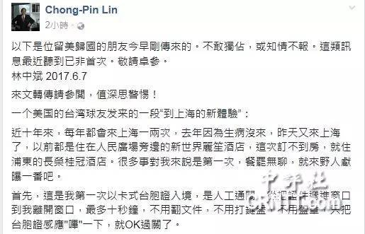 熟悉两岸事务的台“前国防部副部长”林中斌最近在脸书上转发了他一位住在美国的台湾朋友发给他的一篇文章《到上海的新体验》,大谈上海“软体的进步与发展”,结尾表示“我已退休,不拼了,台湾的下一代就自求多福吧!”