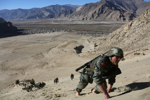 武警西藏总队官兵正在进行抢占海拔4980米无名山制高点冲刺训练。