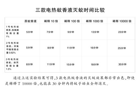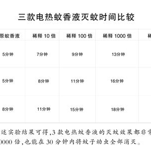 随后,把1号电热蚊香液分别稀释10倍、100倍、1000倍、10000倍,并分别取稀释后的电热蚊香液1毫升,分别加入4个盛有149毫升脱氯自来水的器皿中,以同样的方法进行实验,逐一记录蚊子幼虫全部死亡所需的时间。1号电热蚊香液实验完成后,再以同样的方法对2号电热蚊香液、3号电热蚊香液进行实验,分别记录时间。