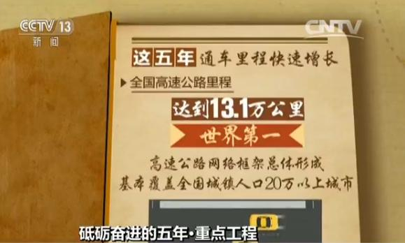 这五年,我国高速公路通车里程快速增长,截至去年底全国高速公路里程达到13.1万公里,居世界第一。高速公路网络框架总体形成,基本覆盖全国城镇人口20万以上城市 。