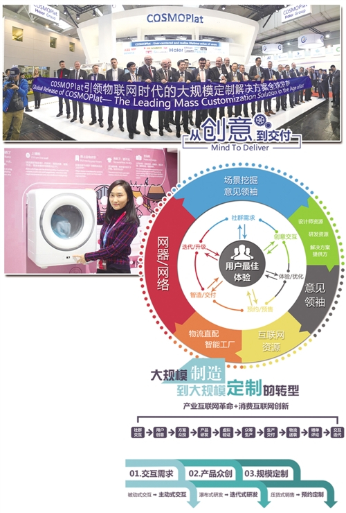 图① 在2017德国汉诺威工业博览会上,海尔面向全球发布具有独创性和引领性的工业互联网平台——COSMOPlat大规模定制解决方案。