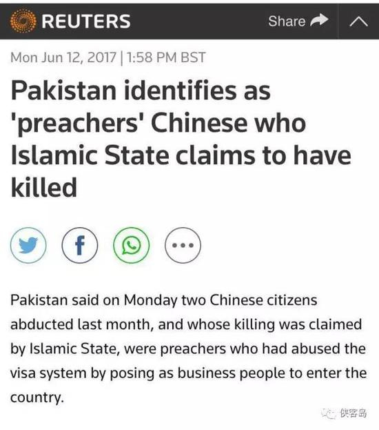 两名中国公民在巴基斯坦境内遭到ISIS绑架和杀害一事,今天有了最新的进展——路透社消息称,周一,巴基斯坦方面确认,被杀害的两名中国公民是“传教士”。