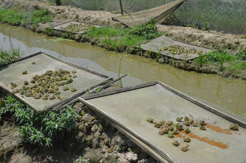 “昨天我和工人们一起抓了500斤左右的青蛙,今天早上一早,重庆下来的商贩就拉着走了,商贩说明天他还要过来拉。”邓久万一边介绍着基地青蛙的销售,一边提着饲料往投食台走去,只见他熟练地将饲料撒在投食台上,一颗颗饲料在食台上滚动着。