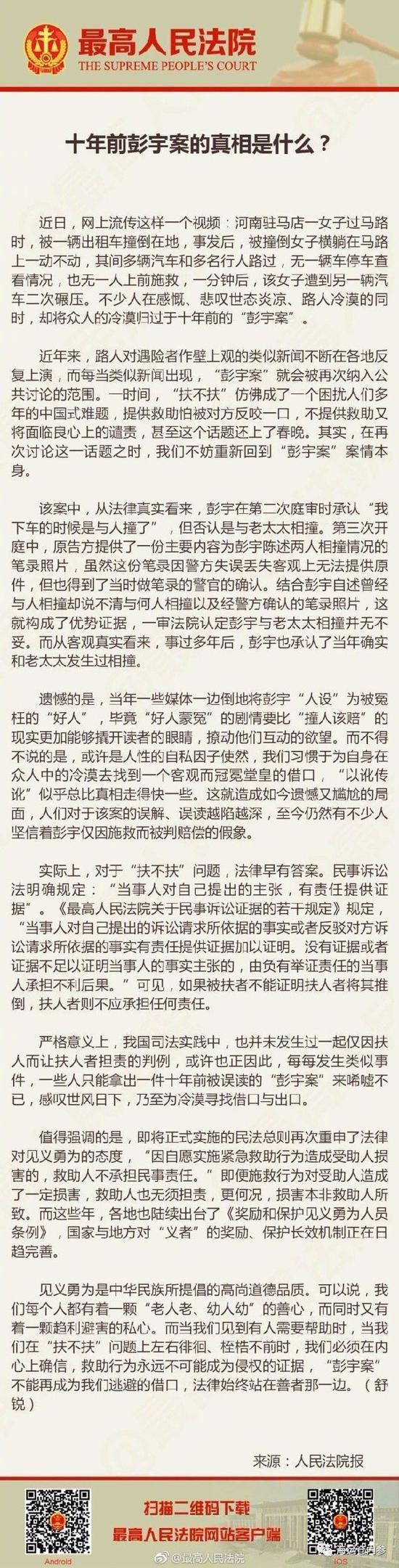 6月15日,最高人民法院官微转发了《人民法院报》一篇文章,题为《十年前彭宇案的真相是什么?》,细述了一直以来不时被舆论提及的“彭宇案”的真相。文章刊发的大背景就是近年来在各地反复上演的路人对遇险者“作壁上观”现象。而前段时间,河南驻马店某女子被车撞倒后,路过行车和行人未及时相救,遭二次碾压后身亡的悲剧,更让舆论回忆起了当年的彭宇案。