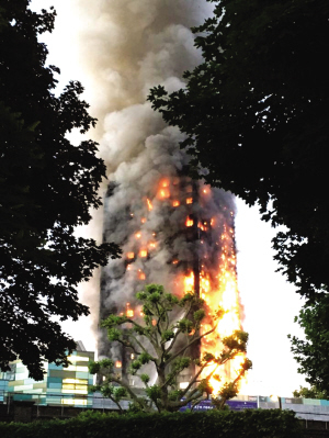 记者在现场看到,截至当地时间14日早上6时30分,大楼火势依然凶猛,滚滚浓烟升到高空,空气中弥漫着烧焦的味道。有起火大楼附近居民在社交网站上发布消息说,看到有建筑碎片从楼上掉落,听见楼内传出爆炸声,还有人哭喊求救。