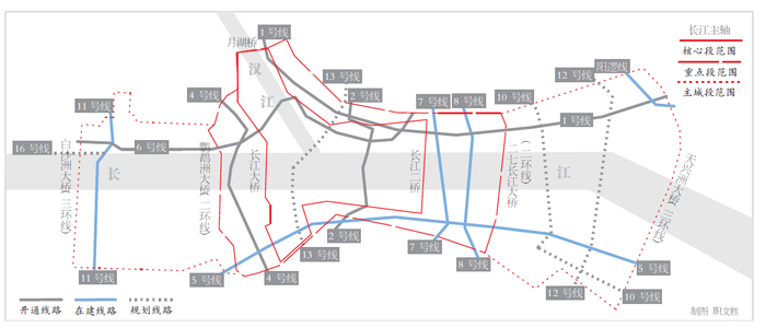 根据测算,105座地铁站点800米半径(相当于10分钟步行范围)覆盖超过80%以上的长江主轴城市建设用地,其中左岸汉口段覆盖率接近90%。