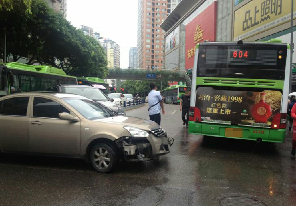 6月15日上午10时早高峰时段,江北公安分局交巡警支队五里店大队民警接到报警称:五里店东方灯饰广场前发生交通事故,一转弯小轿车和直行公交车发生擦挂,需要民警现场定责。