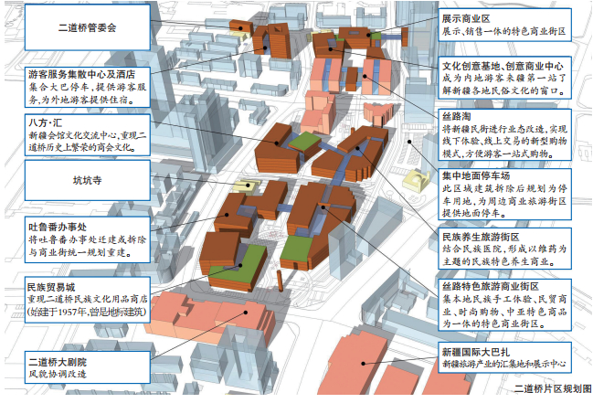 文化:建首个民俗特色展示区 二道桥片区将建展示商业区,形成展示、销售为一体的特色商业街区,还将配套建设文化创意基地,以及新疆旅游产业与当地民俗非遗文化结合的创意商业中心,将成为内地游客来疆第一站了解新疆各地民俗文化的窗口。