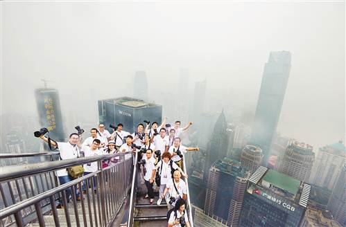 6月18日9∶15,渝中区联合国际楼顶,参加“我爱重庆·精彩一日”百万市民拍重庆主题摄影活动的摄影家与摄影爱好者们冒雨拍摄。 记者 万难 摄