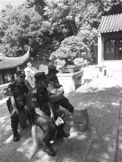 △景区保安拿着喇叭对着“合唱团”播放“文明公约”。