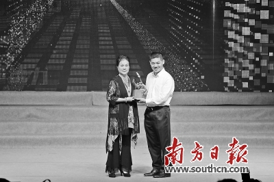 粤剧名家林锦屏代表“林氏三杰”领取“关爱桂城”金桂勋章。 资料图片