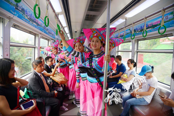 贵州布依族女子来渝推介兴义旅游,惊艳轨道车厢。 兴义市文体广电旅游局供图 华龙网发