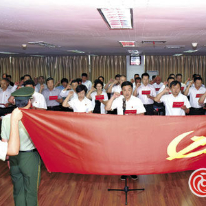 6月16日,米东区委中心组召开集体发声亮剑宣誓大会,市人大常委会副主任、米东区委书记乔泉及区人大、区政府、区政协四套班子领导在党旗下宣誓。(通讯员席辉摄)