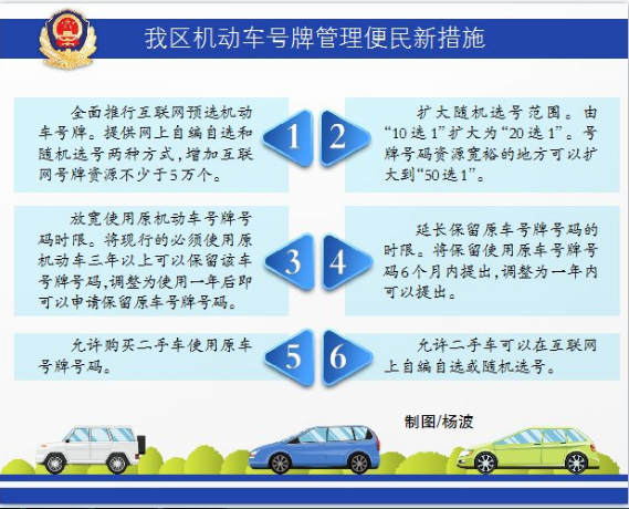 此次便民措施还放宽了使用原机动车号牌号码时限,将现行的必须使用原机动车3年以上可以保留该车号牌号码,调整为使用一年后即可申请保留原车号牌号码。同时,延长了保留原车号牌号码的时限,将保留使用原车号牌号码6个月内提出,调整为一年内可以提出。