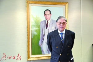 | 霍震霆站在父亲霍英东的油画像前。 |
