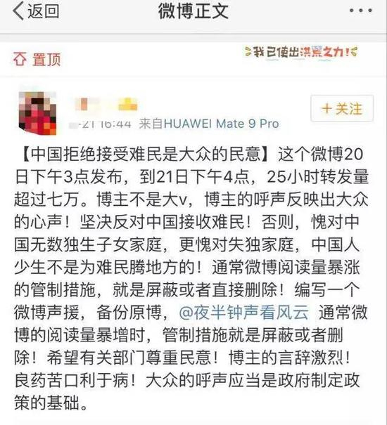 结果,在目前横扫欧洲的难民危机的阴影下,一股强烈的恐慌情绪迅速在中国的网络上被引爆。网友@夜半钟声看风云 一则呼吁中国人都来反对政府接收难民的微博帖子,更是聚集了8万多的转发量。