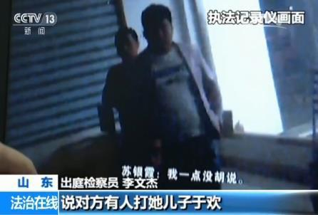 女民警朱秀明看到接待室内双方现场状况非常混乱,于是打电话向值班辅警徐综义请求支援。楼道内的监控也记录了当时的情景。