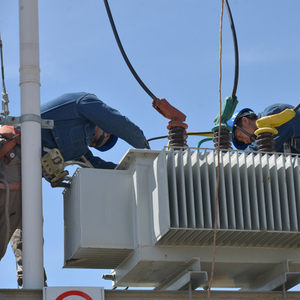 电力工人在检修、维护供电设施。