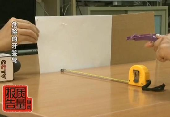 这是记者用摄像机拍摄的画面,很难看清楚牙签飞行的轨迹。在30厘米的距离处,牙签轻易射穿了5张A4打印纸。