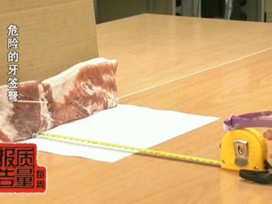 只见牙签深深地插入到猪肉里面,达到1.6厘米之深。