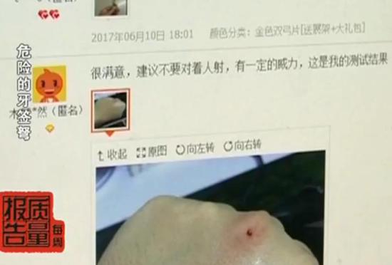 记者注意到,这家店铺里的“牙签弩”的销量不错,近期有800多笔销售单。不少买家都评论说弩的威力不小,射程也很远,也有买家在试用时弄破了手,同时附上了受伤的图片。可是记者浏览了一圈,在店铺的商品说明页面上,却没有发现任何安全标识,也没有出产地和使用说明。