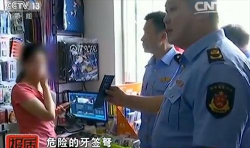 在江西新余一些中小学校周边商店,警方对销售“牙签弩”玩具进行清查登记,向销售者讲解“牙签弩”的危害性。