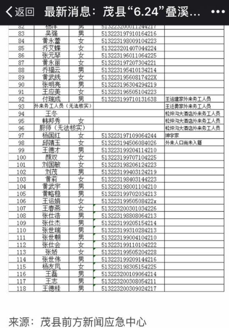 茂县山体垮塌失联者名单由118人减少为116人,张娇、张世伟两人分别排在名单上的113、114。希望有更多失联人员出来“销号”!