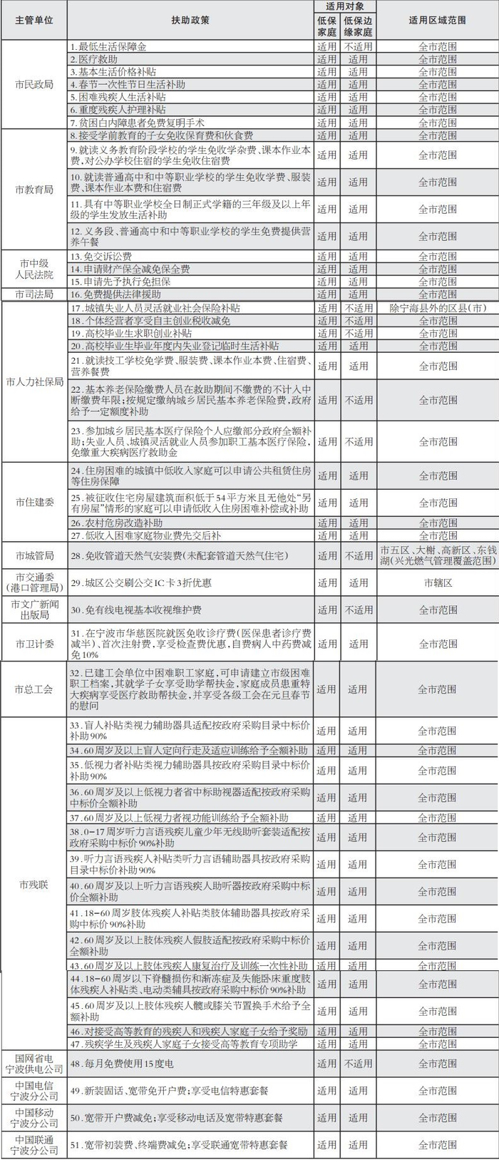 宁波市直部门低保家庭和低保边缘家庭扶持政策一览表