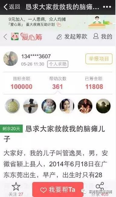 今年5月26日,当她在微信“爱心筹”发出《恳求大家救救我的脑瘫儿子》微信求助时,计划募集10万元爱心款,得到了东莞众多好心人士的爱心帮助。5元、20元、50元、200元不等,纷纷捐款献爱心。从发起日至6月14日,20天内共有361人次捐款,累计捐款11808元。