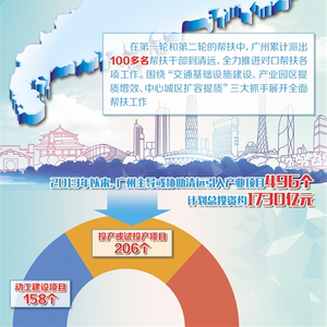 2017年新一轮帮扶工作(2017-2019)拉开序幕,将以广州清远产业共建为重点。广州对口帮扶为清远的发展注入强大动力,自2013年,广清对口帮扶关系确立以来,广州主导或协助清远引入产业项目496个,计划总投资约1730亿元。其中,动工建设项目158个,投产或试投产项目206个,累计完成投资超过450亿元。