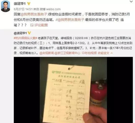 蓝色钱江业主的质问也在继续。有网友在微博上爆料,绿城服务近几日正在“全面篡改消防记录”。