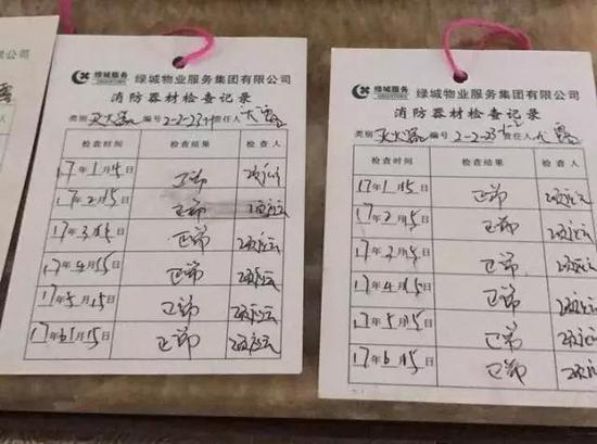爆料还称,绿城方面甚至在临时补增消防设施检查记录↓