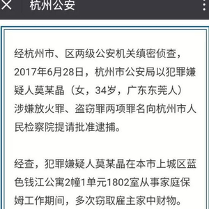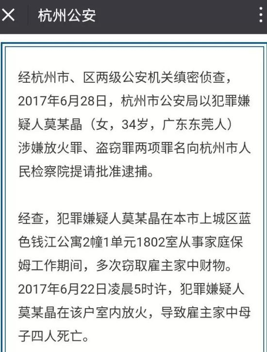 今天中午,杭州警方发布公告:“蓝色钱江纵火案”犯罪嫌疑人莫某晶(女,34岁,广东东莞人)涉嫌放火罪、盗窃罪两项罪名被提请批捕。