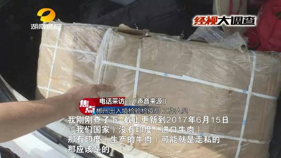 纸箱上贴着的小标签显示,这些牛肉为“印度生产”。记者电话咨询郴州出入境检验检疫局,工作人员在反复求证后,给了记者这样一个答复。