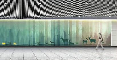 站点风格:选取长春自然生态的代表元素黑松林、梅花鹿,并配以天空、山脉等自然元素作为背景,以四种色调,整体描绘了梅花鹿在树林间穿梭跳跃的生动景象,表现了长春优美宜人的自然风光。利用打孔钢板的材料,并且在梅花鹿位置的孔洞中埋入LED灯带,随着时间的变化以及观者的接触,梅花鹿会亮起灯光,好似真实在林间奔跑跳跃一般,生机盎然。
