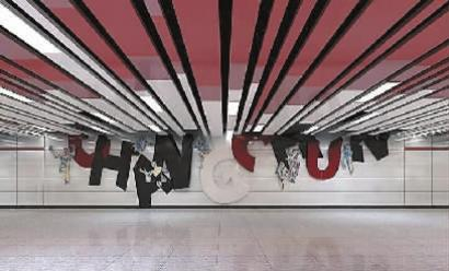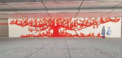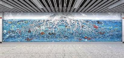 站点风格:方案取材自长春特有的“射线”型城市规划,命名为《长春结》。彩色玻璃组成的几何色块错落有致,交叠排布出一幅极具张力的画面。由画面中点出发,几何拼接的发散性图案像俯视鳞次栉比的现代都市,也像地铁线路四通八达,更暗喻长春的未来像光芒,辐射东北区域,甚至全国。用彩色玻璃镶嵌的方式来表现画面。因为玻璃通透,色彩丰富,视觉效果优美,很有现代气息。在人潮涌动的中央商务区,聚集的都是白领精英、商务人士,这面彩色玻璃艺术墙能成为人们眼中的一道华美而舒适的风景线,灵动的颜色能够有一定的缓解压力的作用。